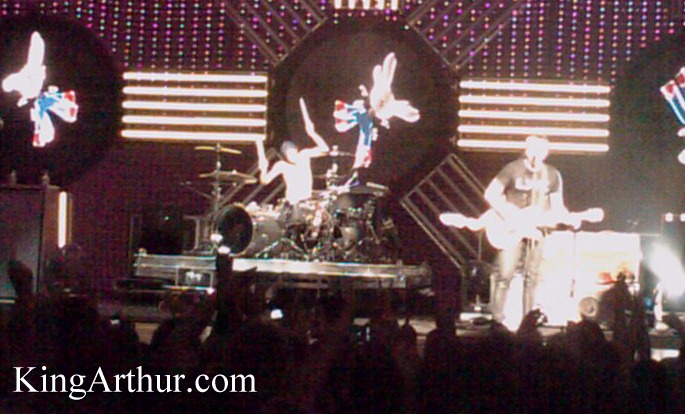 Finally, blink-182 took the stage. It was a great show, and they played all of their greatest hits. Tom Delonge modified a few of the songs to his own "live" adaptation. Replacing words like "love" with phrases like, "give me a blowjob". It was quite comical and entertaining. It fit the image of blink and made fans fall in love with them all over again. The initial set was amazing, but the encore was icing on the cake. The curtains reopened and Travis Barker started his epic drum solo wearing some weird shirt/top. Most of the audience couldn't figure out what it was until Barker started floating. Right there in front of our eyes... Travis and his drum set started flying off the stage and into the air. Like something out of a guitar hero game, Barker flew from side to side of the stage, the entire time performing a drum solo of magnificent propositions. Barker re-centered and suddenly went horizontal, so that the audience was looking "down" on him. The drum set was fixed onto a lazy-Susan so that Barker started spinning in circles while flying. Even with enough distractions to throw off most people's equilibrium, Travis continued to play his drum solo. The crowd was silent until Travis touched back down at which point they erupted into applause. Everyone was stunned that Barker had the endurance to perform such a stunt after just recently recovering from a near death experience.